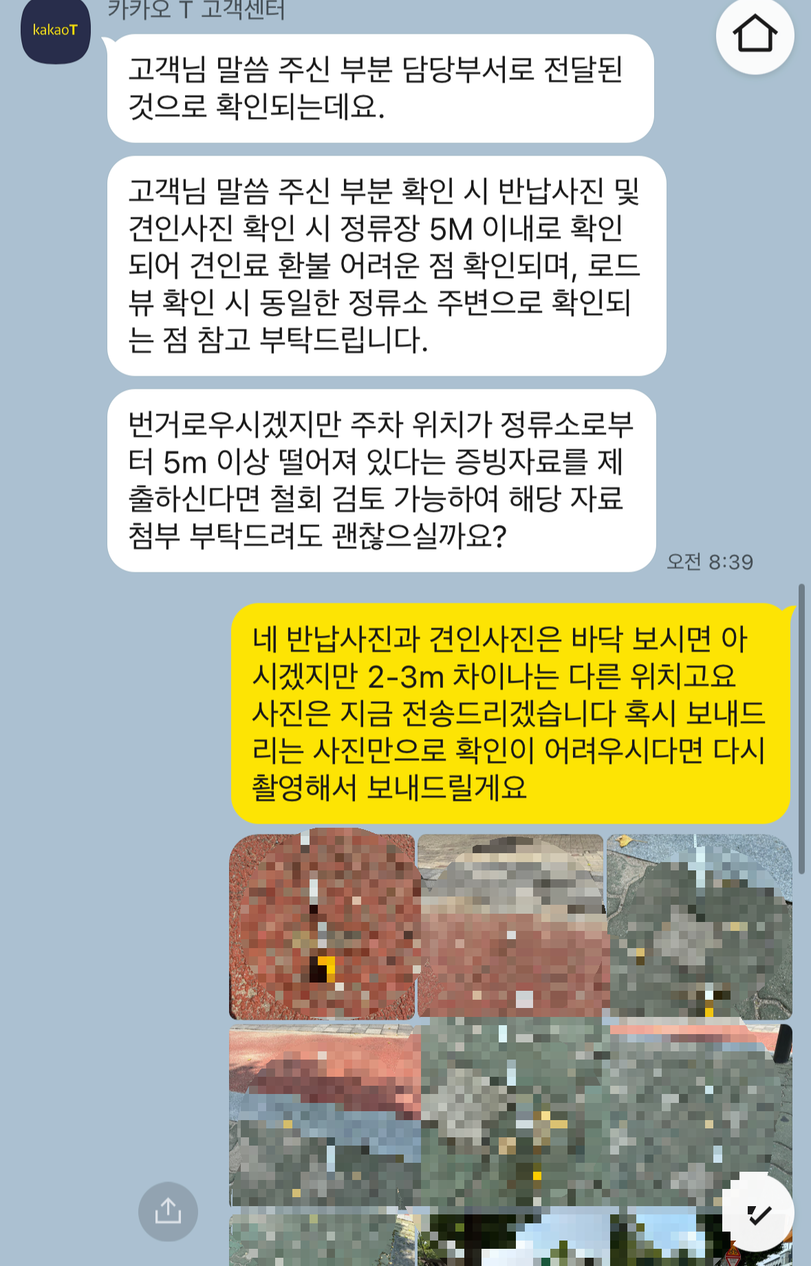우선 카카오T에서 안내한 5m 이내 주차 사유는 해당이 안되기도 하고(실측 결과 해당 없음) 견인 당시 정류소에 더 가깝게 이동되어 찍혔으니 제가 주차한 곳이 아니니 제가 견인료를 부과하는 것은 말이 안된다. 이를 알리려 또 다시 고객센터에 문의를 했습니다. 사진과 함께요. 줄자로 여러 번 재서 6m 이상 되는 위치에 제가 주차했음을 증명하는 사진 여러 장, 반납 사진과 견인당시 사진위치가 다름을 증명하는 제가 촬영한 두 곳 바닥을 확인할 수 있는 풀샷을 보냈습니다.
