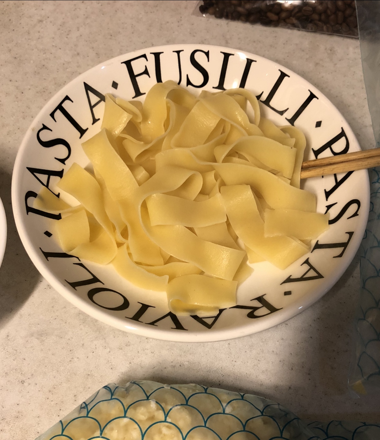 다 삶은 면을 그릇에 건져둡니다. 면 너무 많다고요~~ 가뜩이나 넙적해서 양이 정말 많았어요.