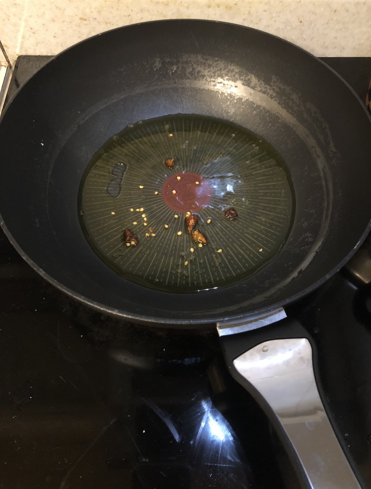 면수는 사용하지 않을 거니 과감히 버려주시고요, 올리브유를 잔뜩~ 두른 뒤 페페론치노를 부셔 넣습니다. 저는 한 네 개정도 넣은 것 같은데 개인의 기호에 따라 양은 조절해주세요.