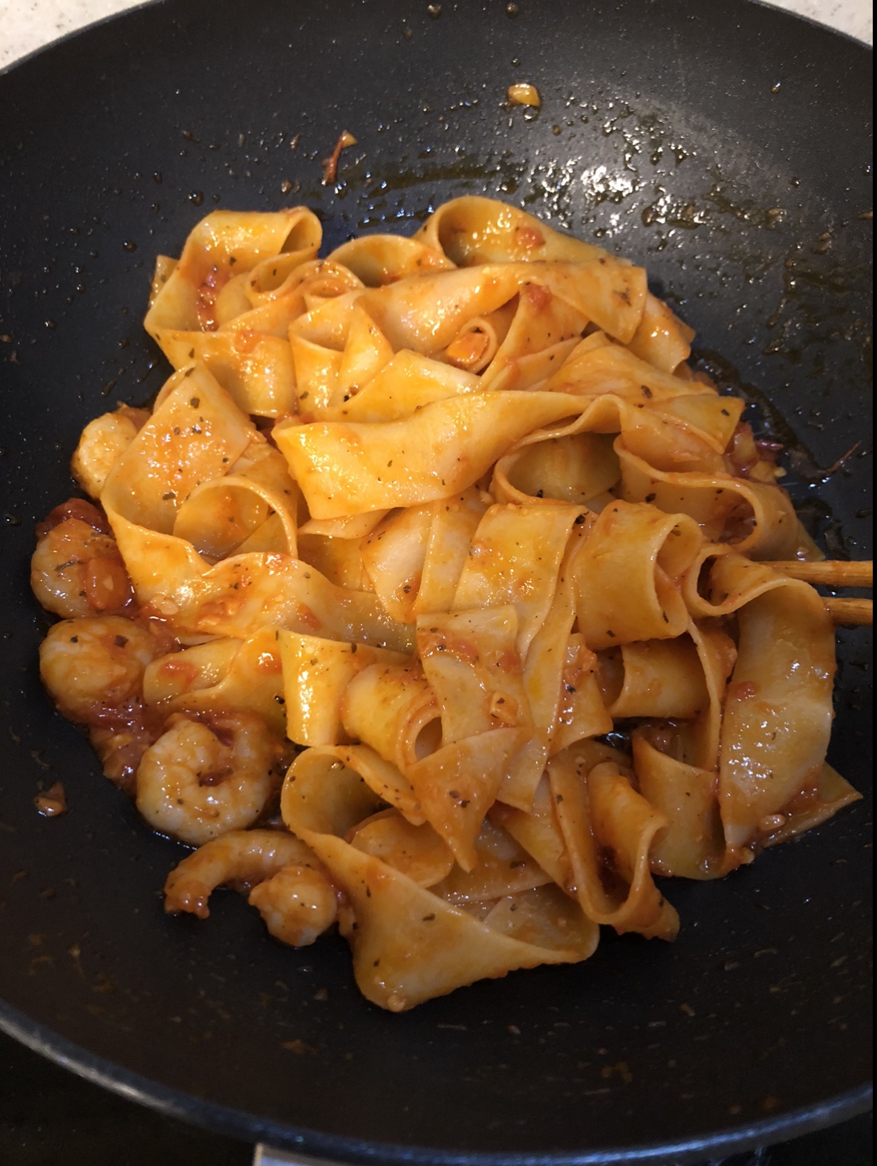 면, 올리브유, 페페론치노, 토마토소스, 다진마늘, 소금, 후추, 새우