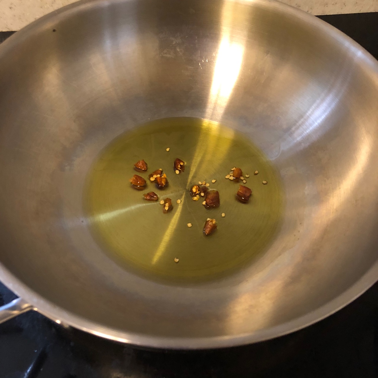 면이 삶아지는 동안 소스를 만들어보겠습니다. 팬에 올리브유를 두르고, 페페론치노를 으깨 넣어줍니다.