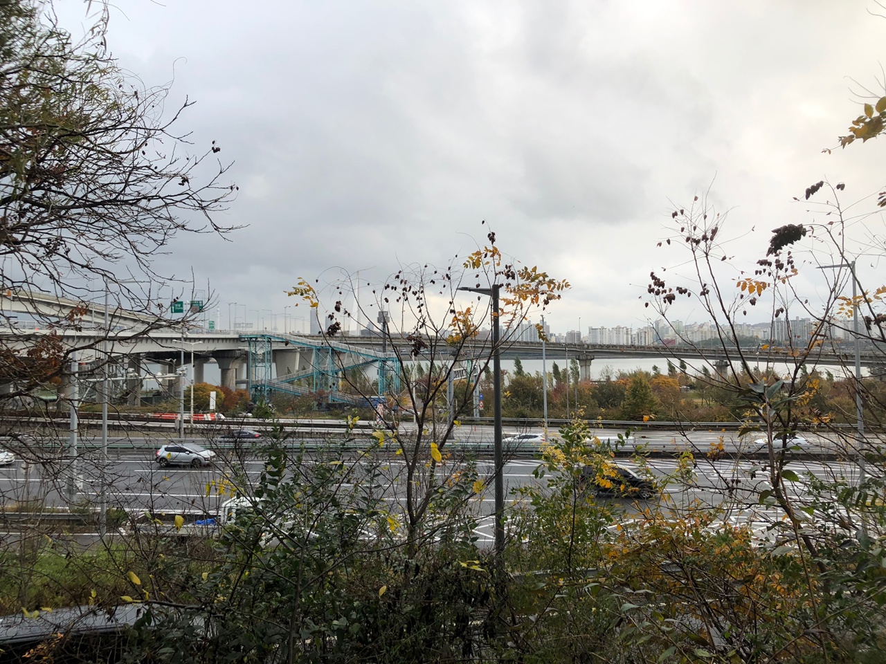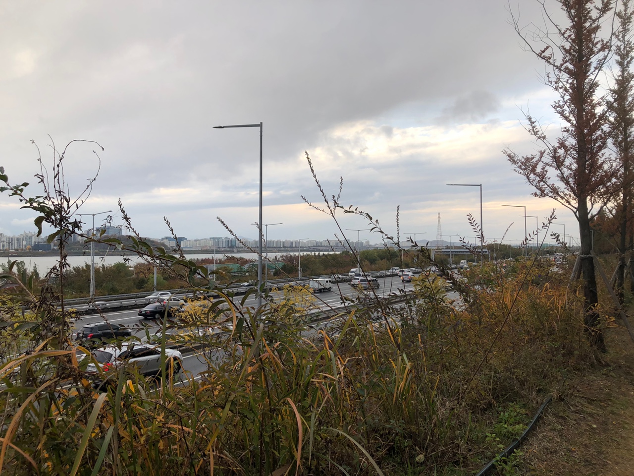 그렇게 메타세콰이어길을 걷다가 보면 얼마 안있어 강변북로와 한강이 나타납니다! 이 부근 강변북로를 지날 때 일자로 난 숲길에 간간히 사람들이 산책하는 것을 목격하고 언젠간 꼭 와봐야겠다고 생각했는데 드디어 이 길을 걸어보았네요.