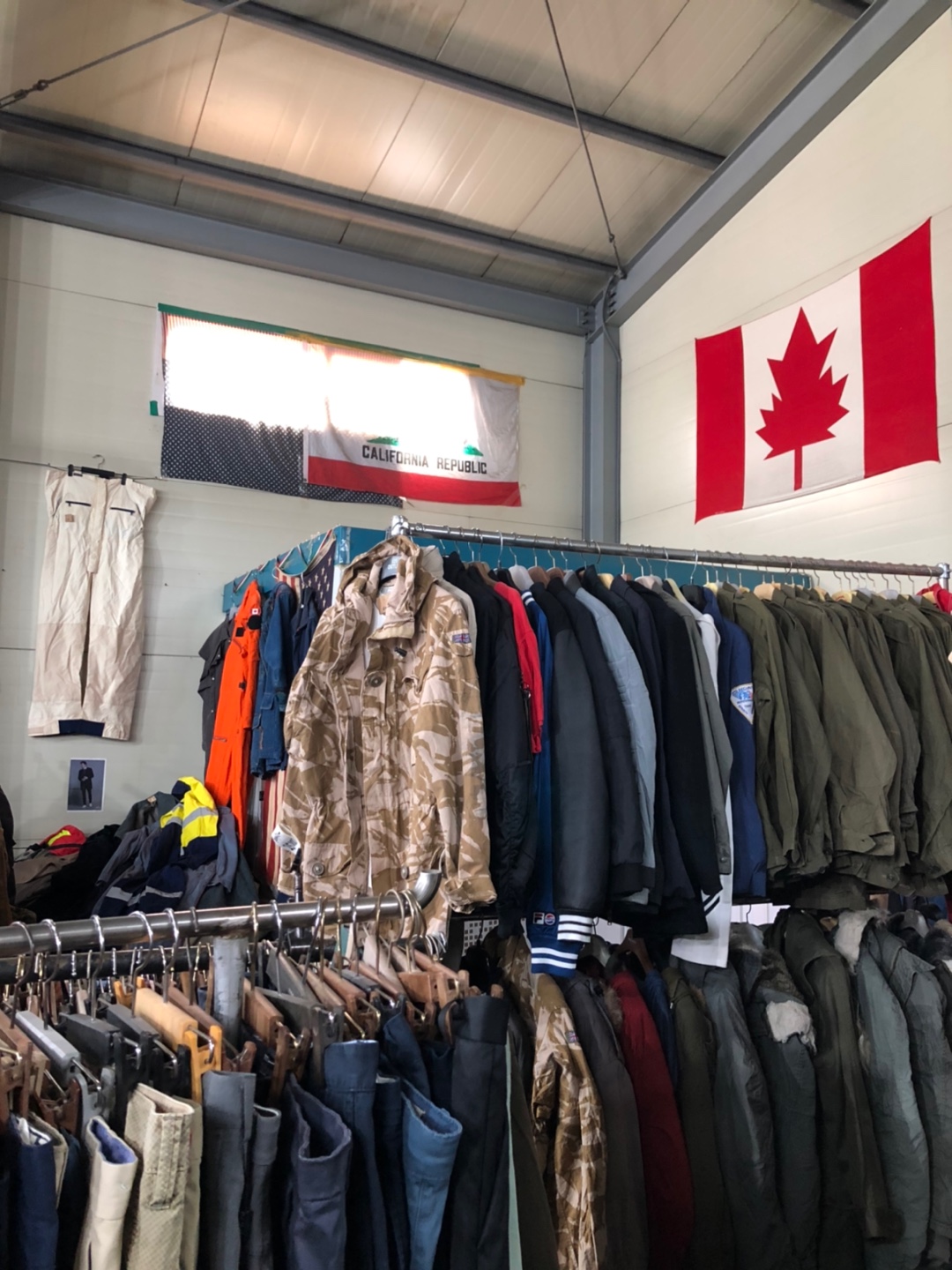 캘리포니아의 주기도 걸려져 있고요, 미국 LA 의 노숙자들 보면 지저분한 패션이지만 동시에 뭔가 정말 힙했는데ㅋㅋ(노숙자들이 옷을 잘입으시더라고요) 그분들이 입으실 법한 항공 점퍼들도 많았습니다.