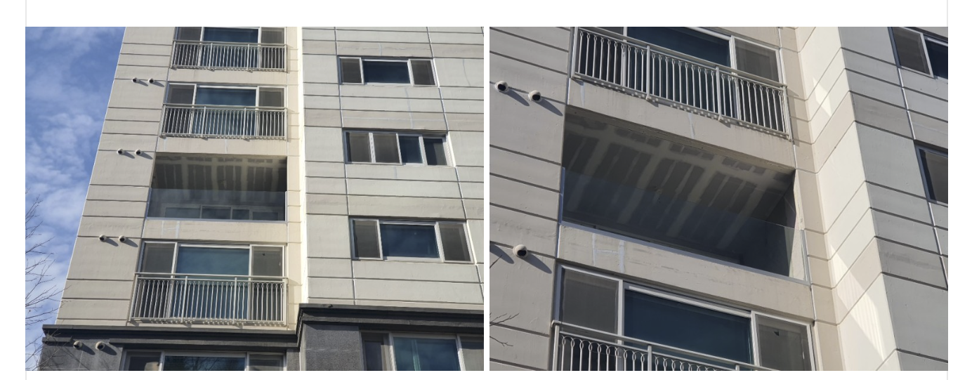 일단 전형적인 우리나라 아파트의 외관 모습입니다. 제가 싫어하는 난간이 역시나 부착되어있습니다. 제가 싫은 부분은 난간 자체가 아닙니다. 샷시와 딱 붙어있다는 게 싫은 겁니다. 그냥 다면창으로 주상복합 창처럼 위에만 열리는 창을 설치하든가 아무튼 제가 굉장히 싫어하는 우리나라 주택의 특징입니다. 그런데 이제 공사중이라 외벽 샷시가 없어진 모습을 보니 어떠신가요? 건물의 외관 상 인앤 아웃(입체감)이 있으니 훨씬 풍부하지 않나요? 전 우리나라 건축물들이 발코니를 좀 만들어서 건물 외벽이 일자로 쫙 떨어져서 성의 없게 건축한 그런 모습을 좀 탈피했으면 합니다.