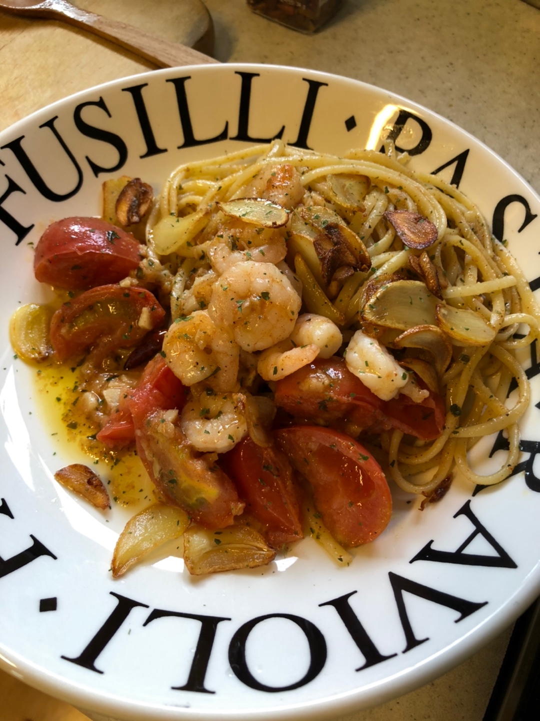 올리브유, 화이트와인, 새우, 마늘, 토마토, 면, 소금, 후추, 칠리파우더, 페퍼론치노, 파슬리가루, 양파가루(선택사항)
